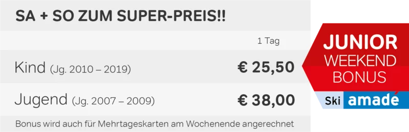 Ganz im Sinne einer großzügigen "Jugendsportförderung" fahren in ganz Skiwelt amadé, Österreichs größtem Skivergnügen, Kinder und Jugendliche an jedem Wochenende (jeden Samstag und Sonntag) zu ermäßigten Preisen mit bis zu 35 % Rabatt gegenüber dem Normaltarif*: